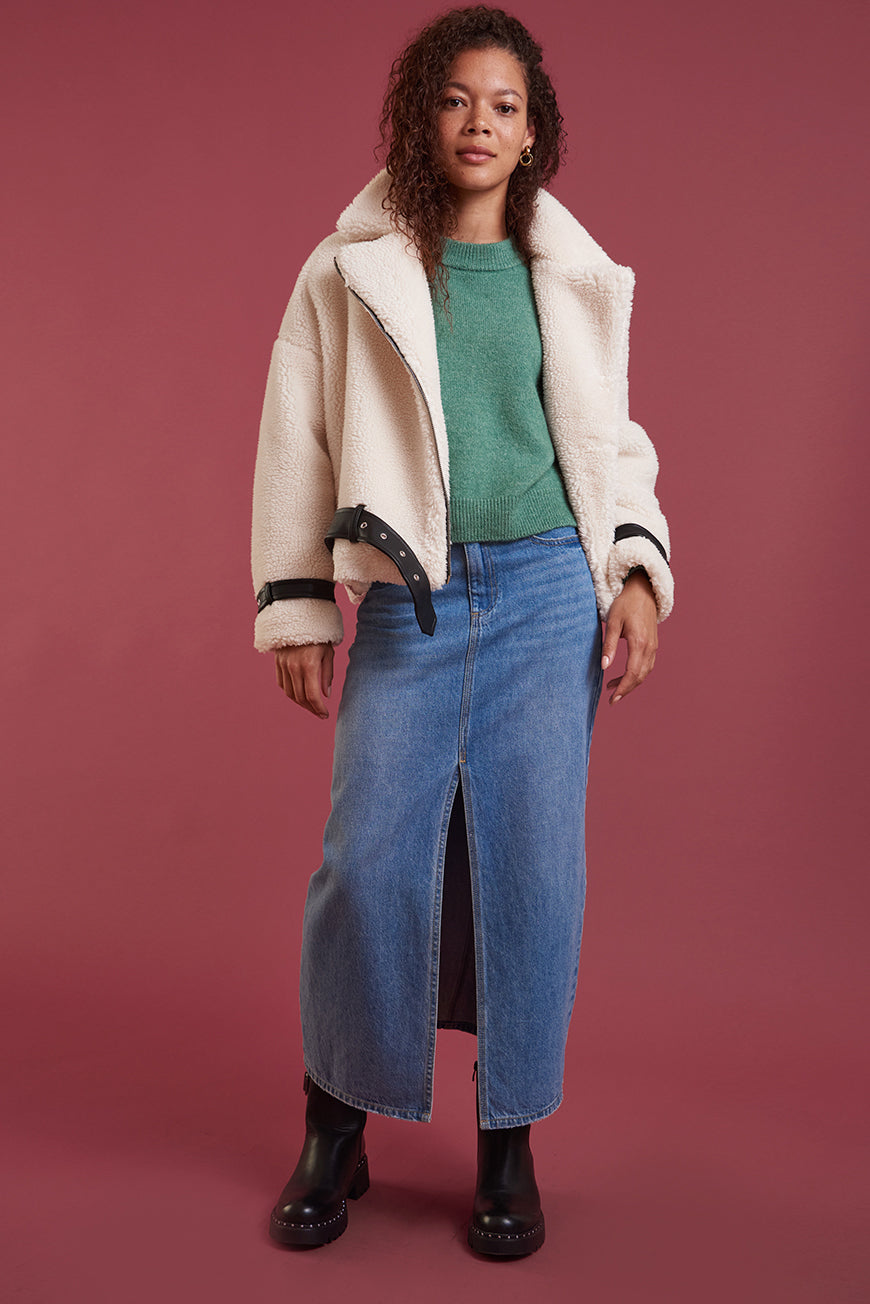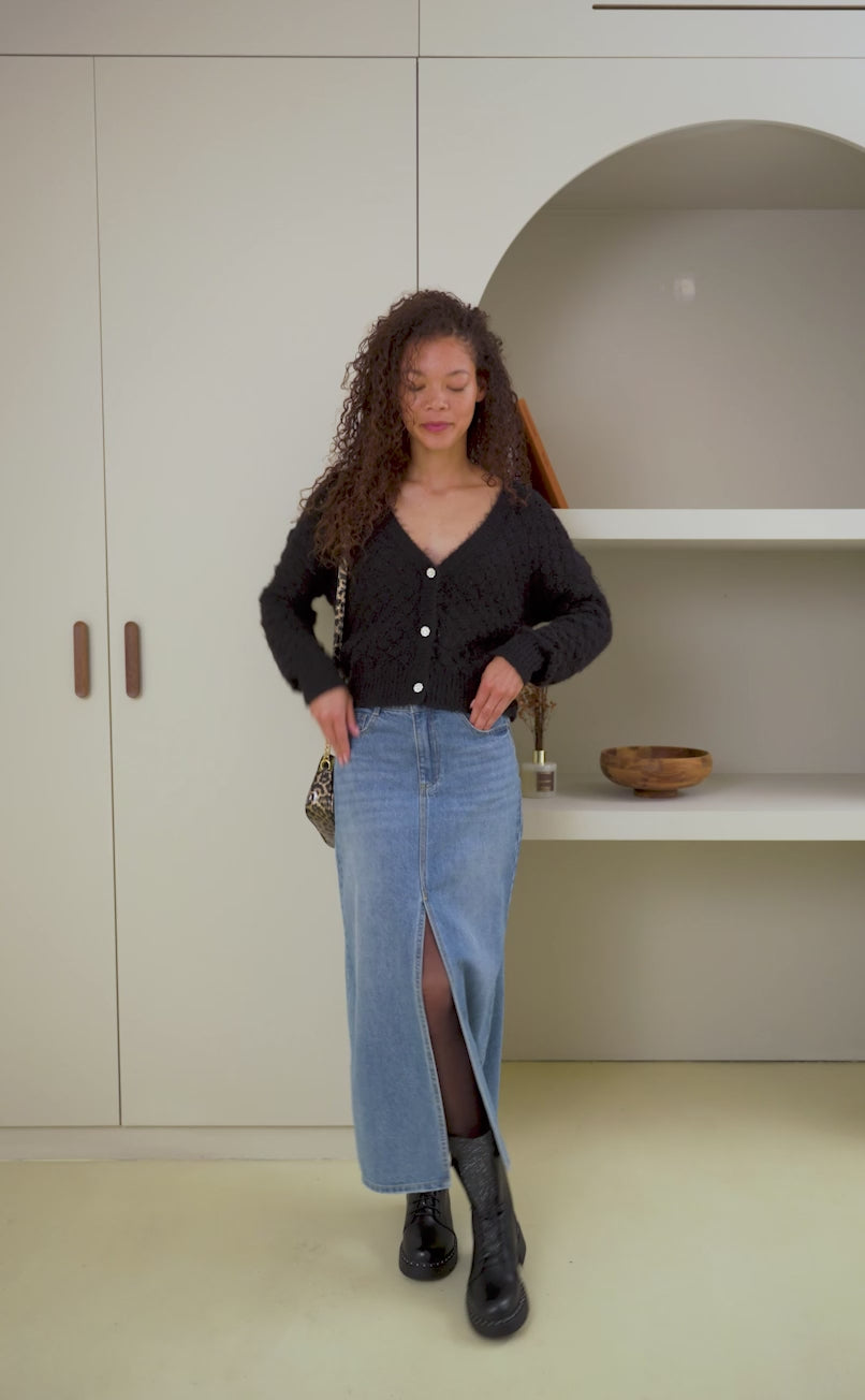 - À l’entrée de l’automne : superposez-la avec un gilet fin boutonné et des chaussures pointues pour un look citadin raffiné.