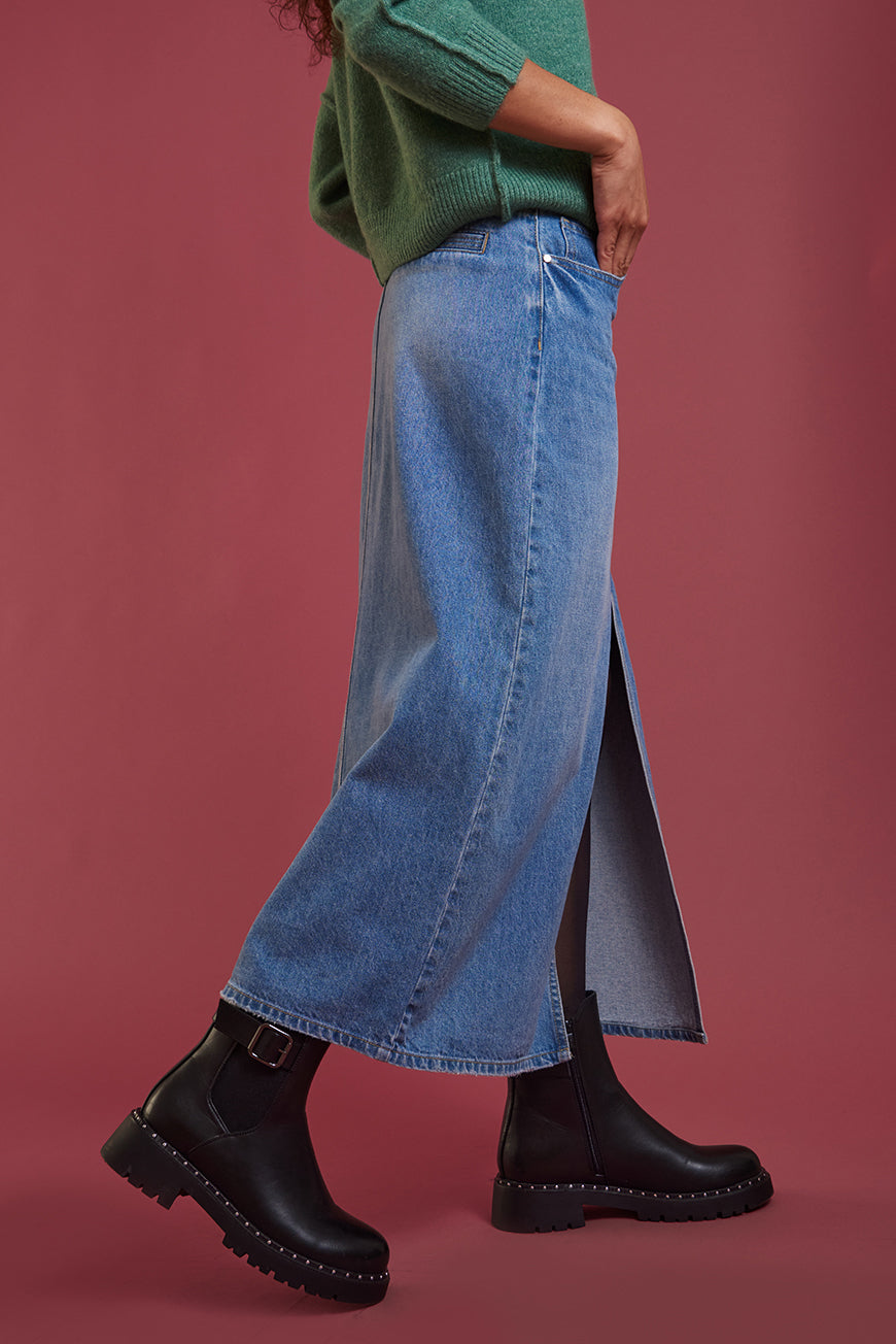 - Coupe denim longue fluide, pensée pour donner une allure gracieuse